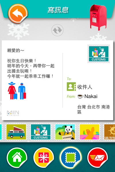 MIIN POST最基本的功能,就是讓使用者寄出電子明信片,看到喜愛的明信片,就朝中間的特寫大圖點下去吧!!!(明信片的內容會針對各大節日進行持續更新。)